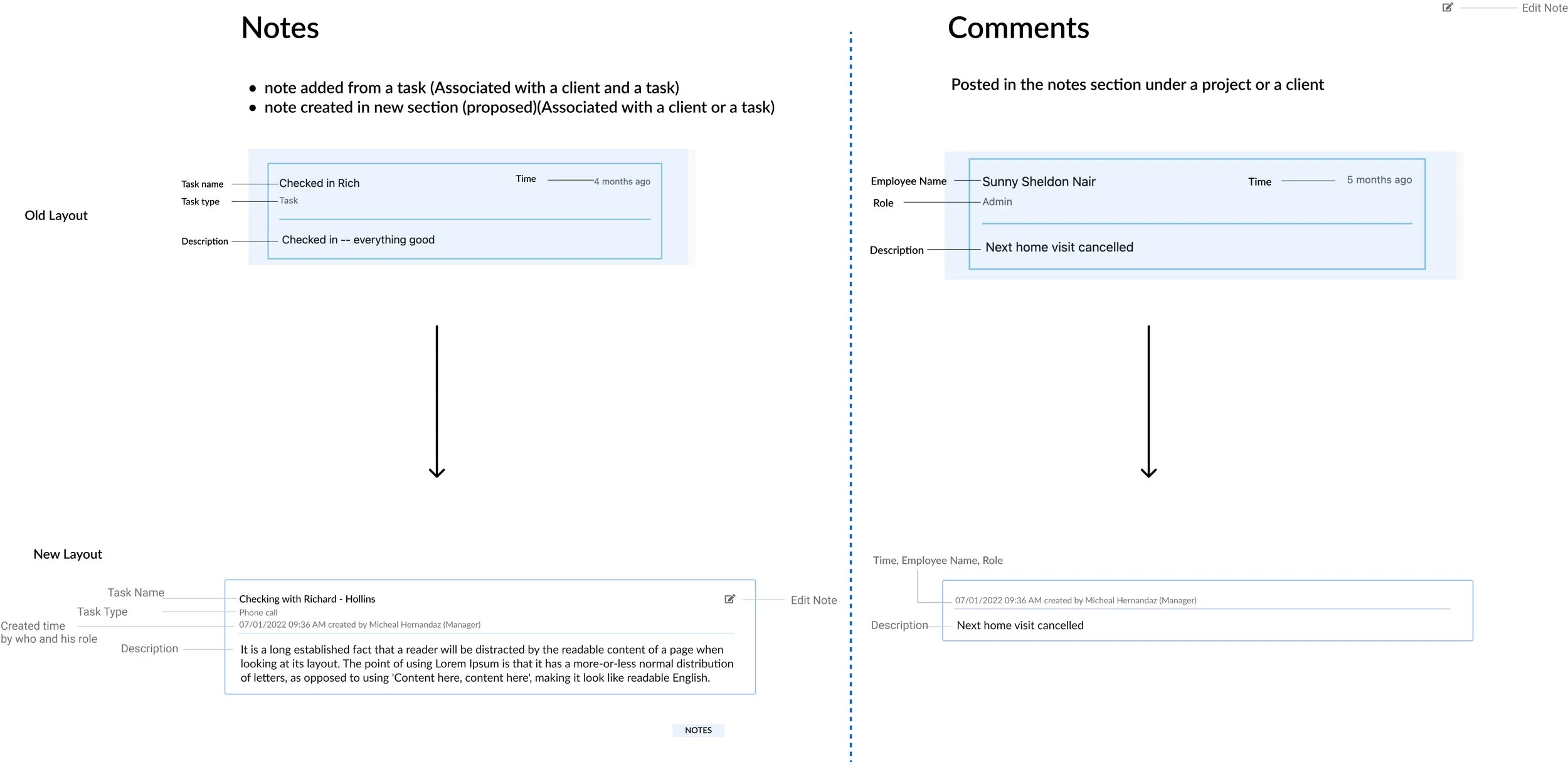 The Notes section, available on both customer and project pages, displays notes added during task creation and comments by employees. While currently integrated, there's consideration to distinguish notes (for annotations/reminders) from comments (for discussions). The suggestion is to possibly retain comments for discussions on tasks and artifacts, emphasizing their distinct purposes.